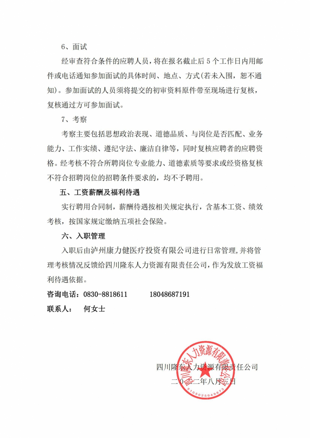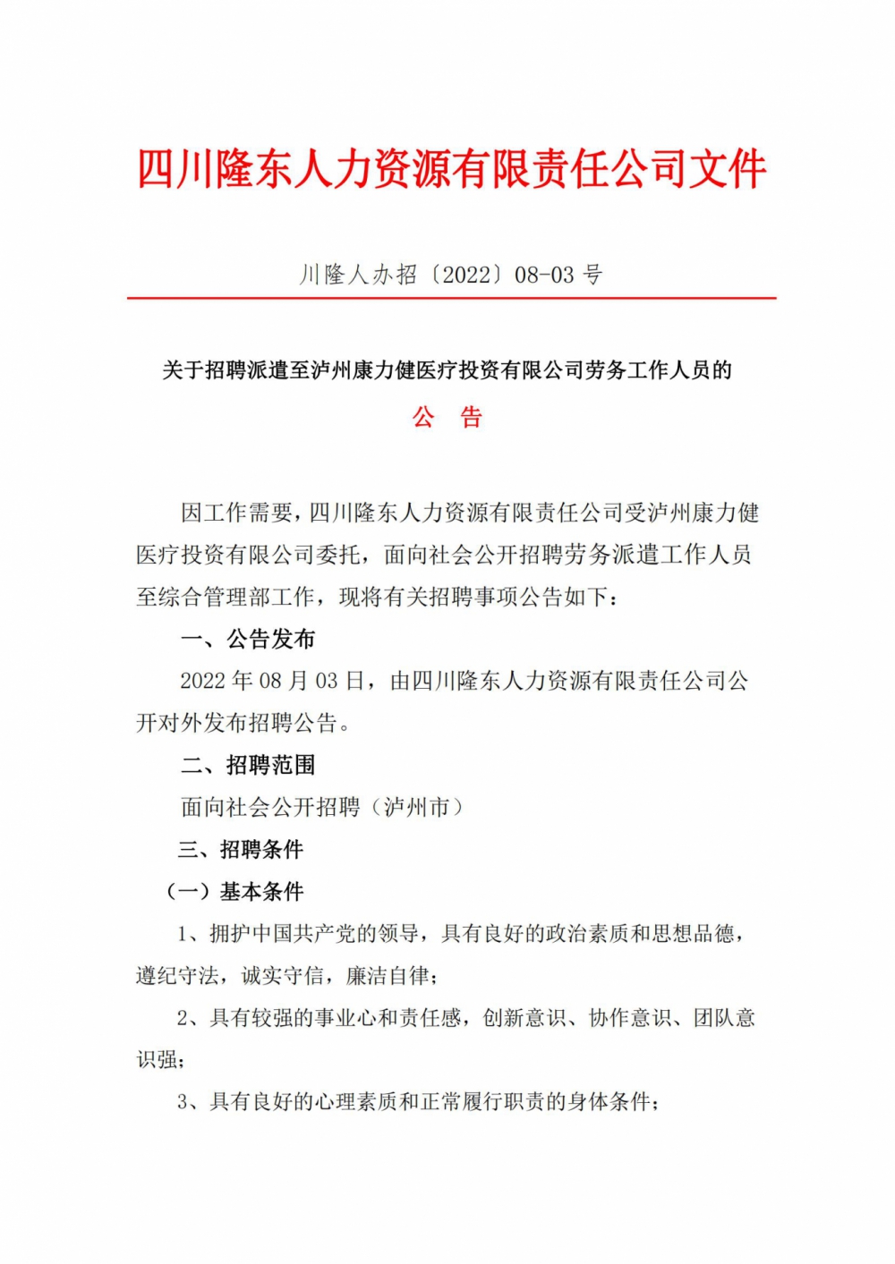 關(guān)于招聘派遣至瀘州康力健醫(yī)療投資有限公司勞務(wù)工作人員的公告