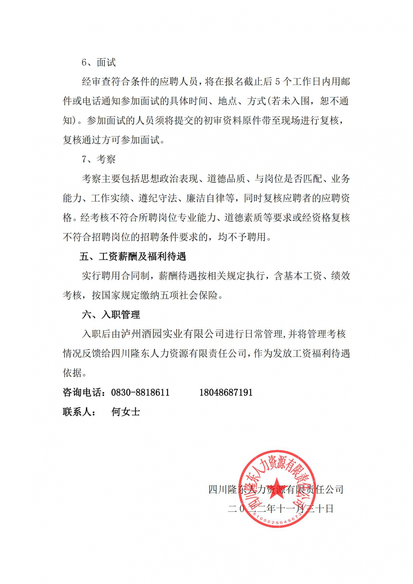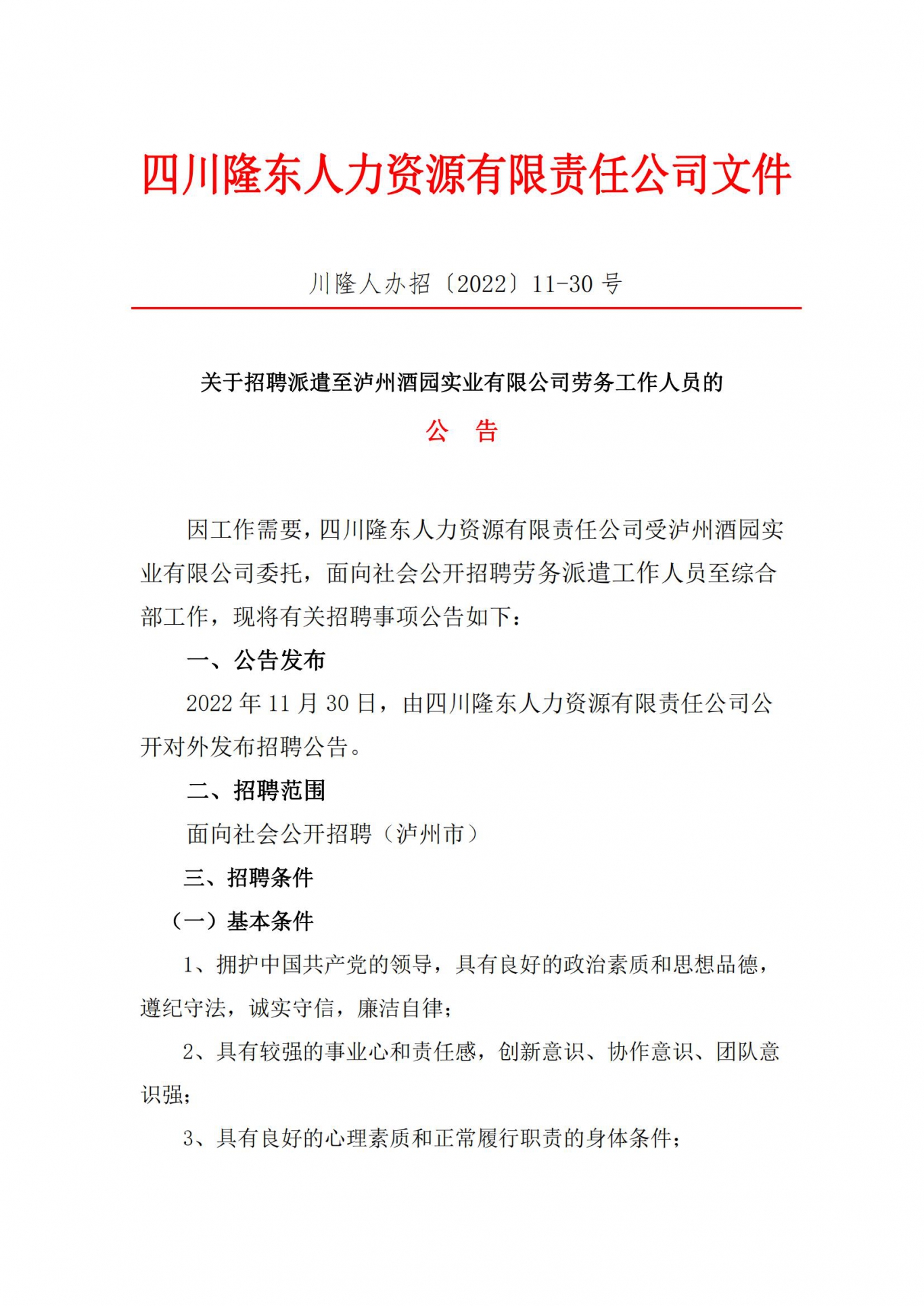 關(guān)于招聘派遣至瀘州酒園實業(yè)有限公司勞務(wù)工作人員的公告