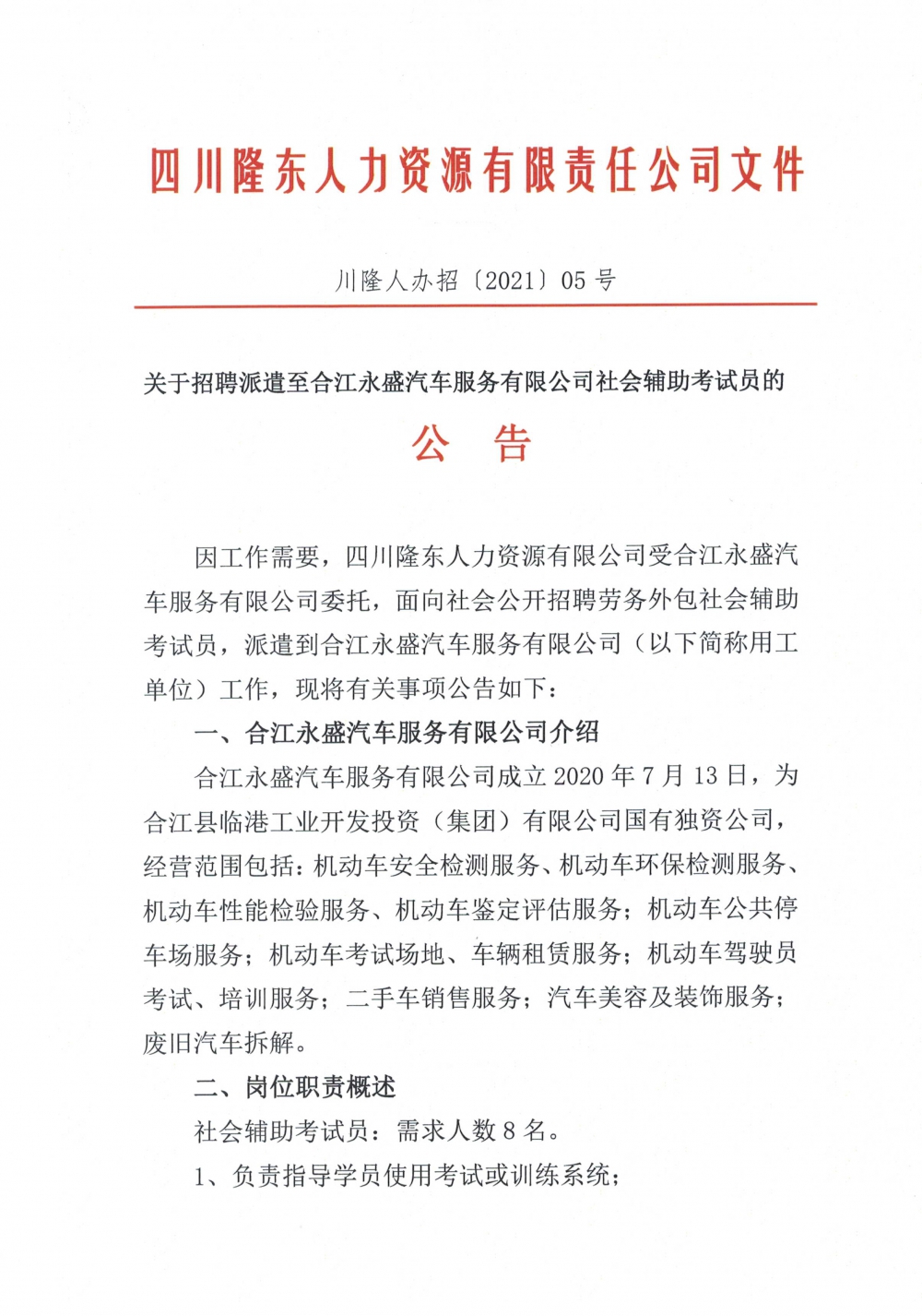 關(guān)于招聘派遣至合江永盛汽車服務(wù)有限公司社會(huì)輔助考試員的 (公 告)