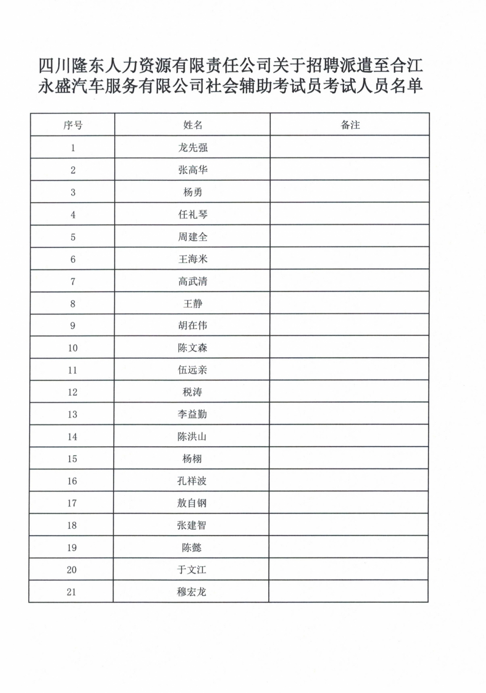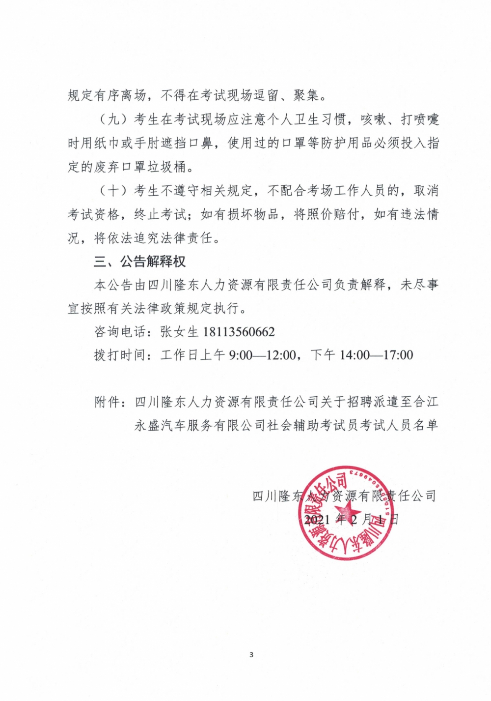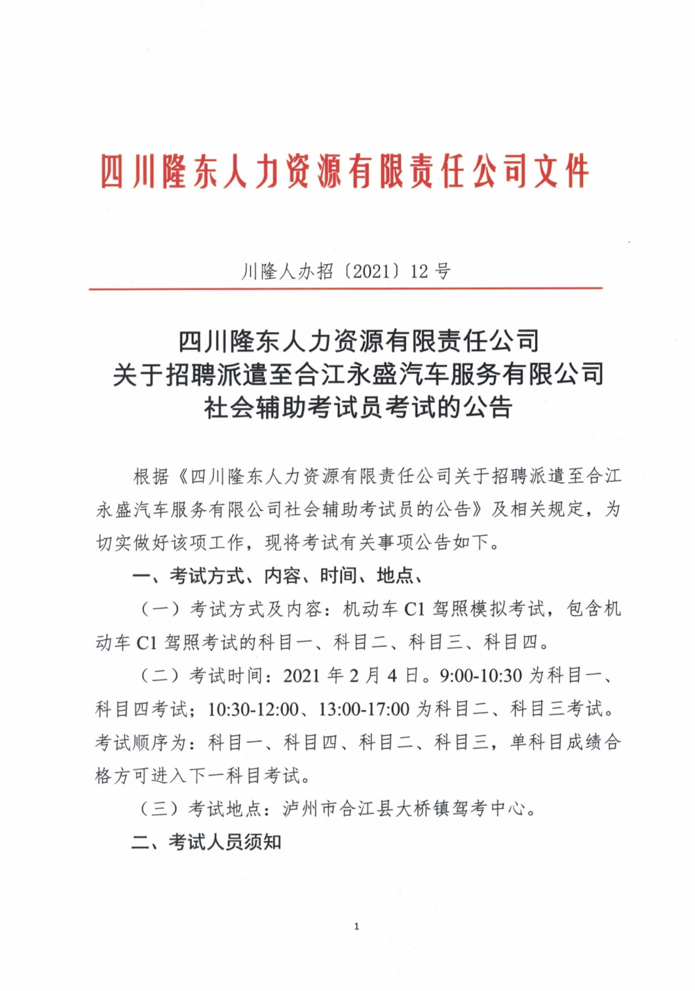 關(guān)于招聘派遣至合江永盛汽車服務(wù)有限公司 社會輔助考試員考試的(公告)