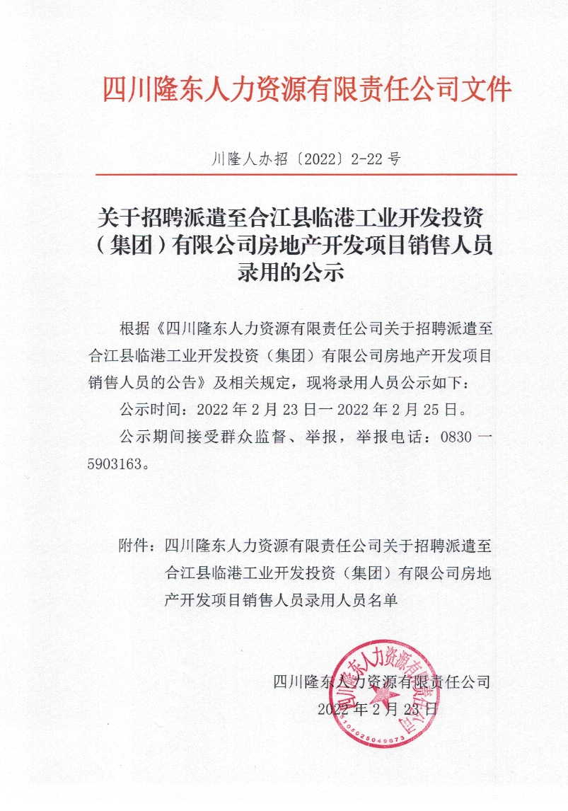 根據(jù)《四川隆東人力資源有限責(zé)任公司關(guān)于招聘派遣至合江縣臨港工業(yè)開發(fā)投資(集團(tuán))有限公司房地產(chǎn)開發(fā)項(xiàng)目銷售人員的公告》及相關(guān)規(guī)定,現(xiàn)將錄用人員公示如下: