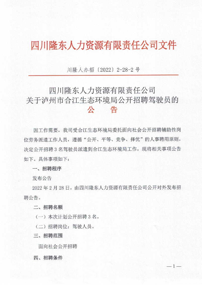 因工作需要,我司受合江生態(tài)環(huán)境局委托面向社會公開招聘輔助性崗位勞務(wù)派遣工作人員,遵循“公開、平等、競爭、擇優(yōu)”的人事聘用原則,決定公開招聘3名駕駛員派遣到合江生態(tài)環(huán)境局工作,現(xiàn)將相關(guān)事項(xiàng)公告如下。