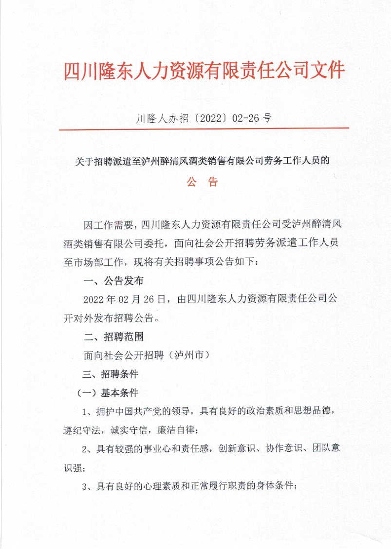 因工作需要,四川隆東人力資源有限責(zé)任公司受瀘州醉清風(fēng) 酒業(yè)股份有限公司委托,面向社會公開招聘勞務(wù)派遣工作人員至 生產(chǎn)技術(shù)部工作,現(xiàn)將有關(guān)招聘事項(xiàng)公告如下