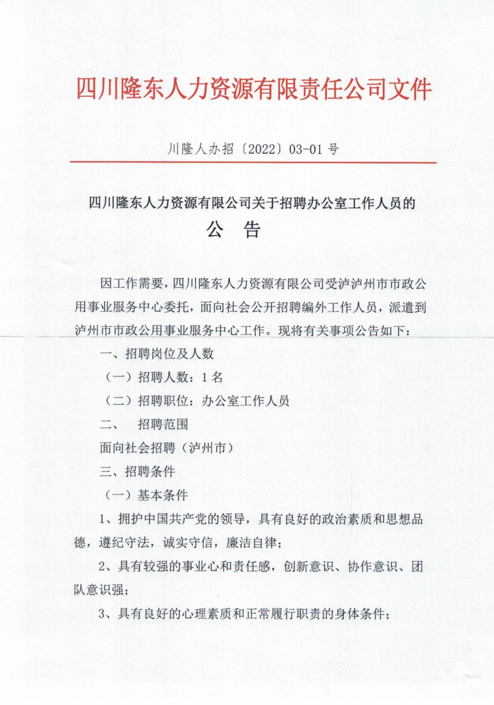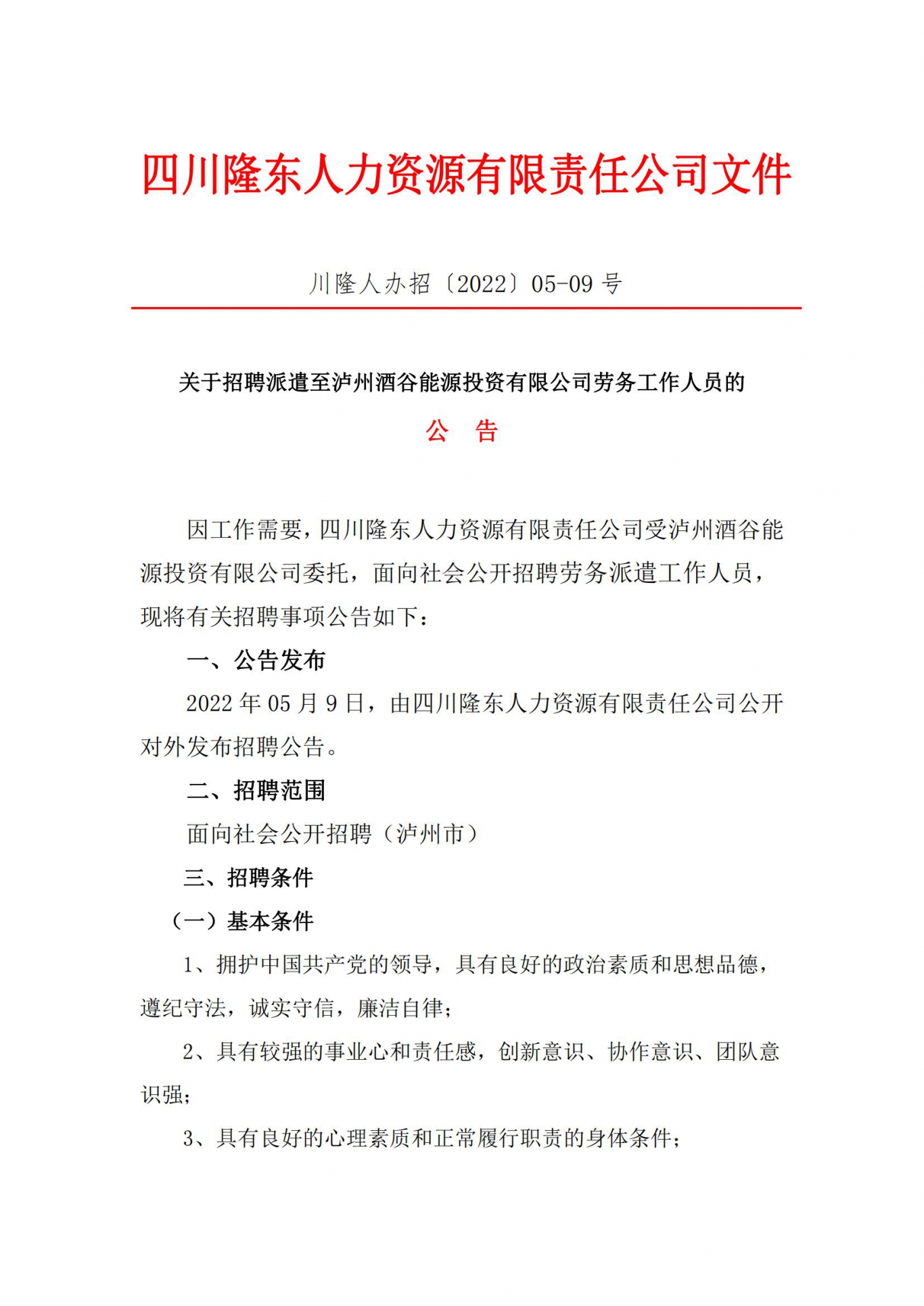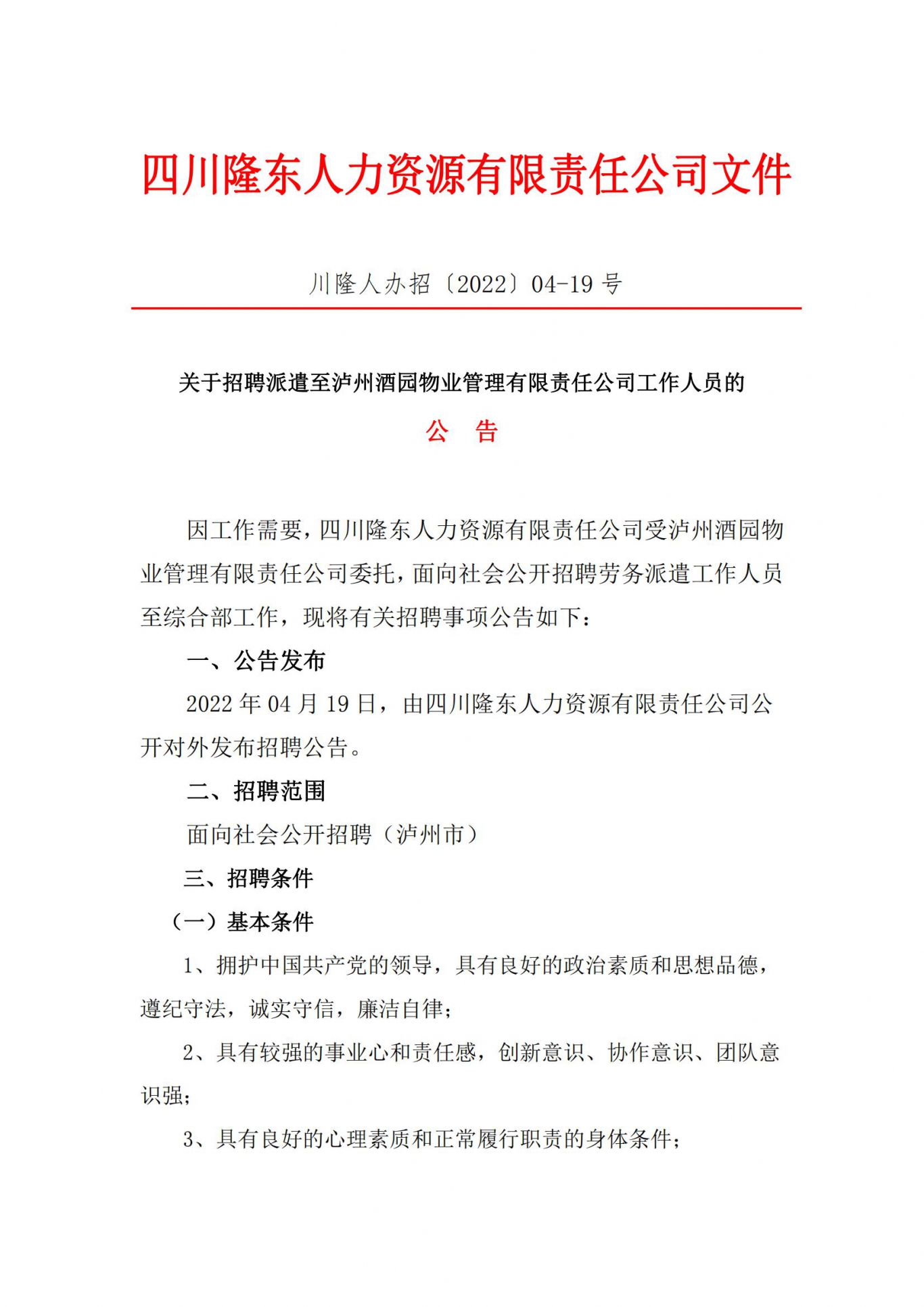 因工作需要,四川隆東人力資源有限責(zé)任公司受瀘州酒園物 業(yè)管理有限責(zé)任公司委托,面向社會公開招聘勞務(wù)派遣工作人員 至綜合部工作,現(xiàn)將有關(guān)招聘事項(xiàng)公告如下