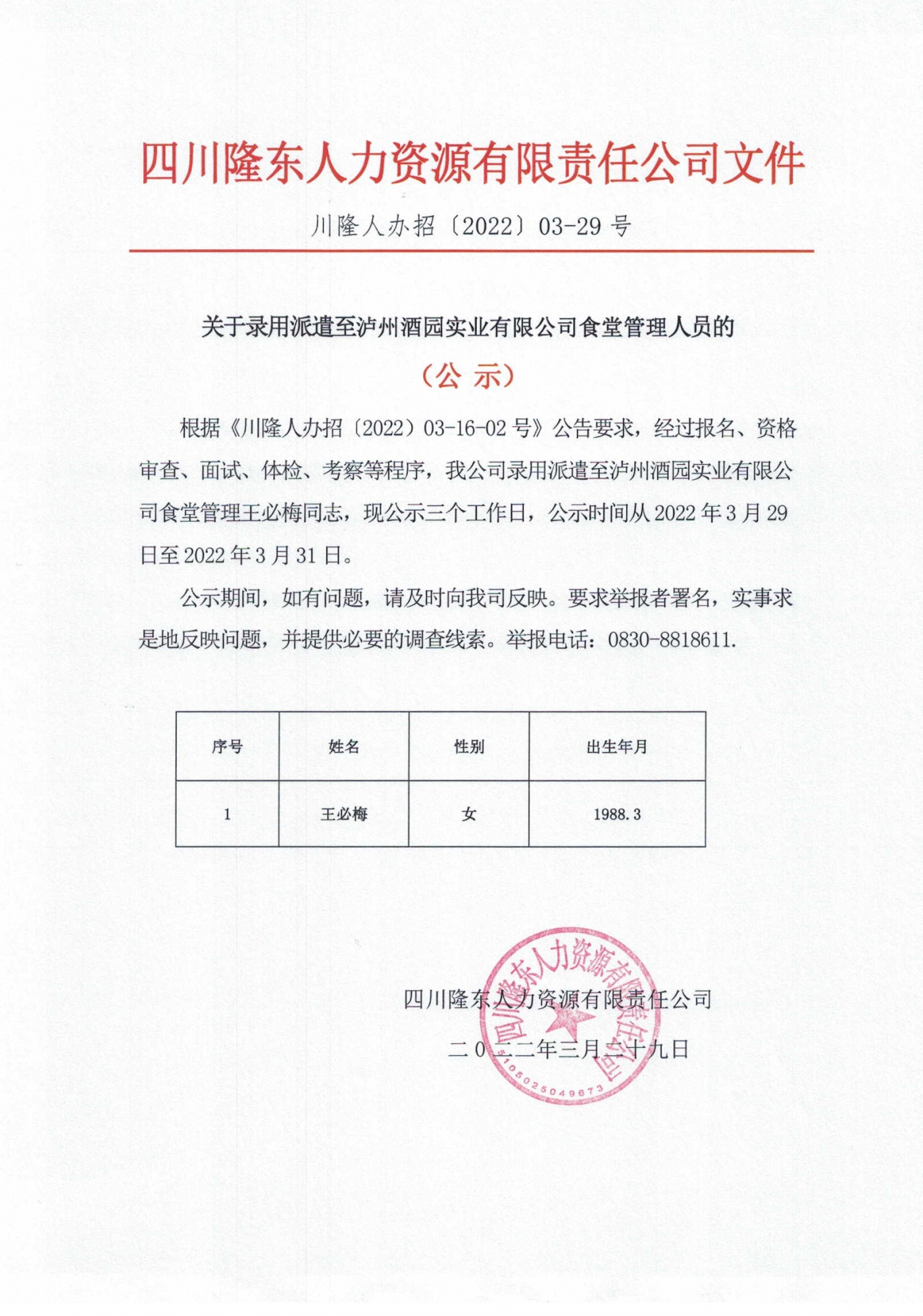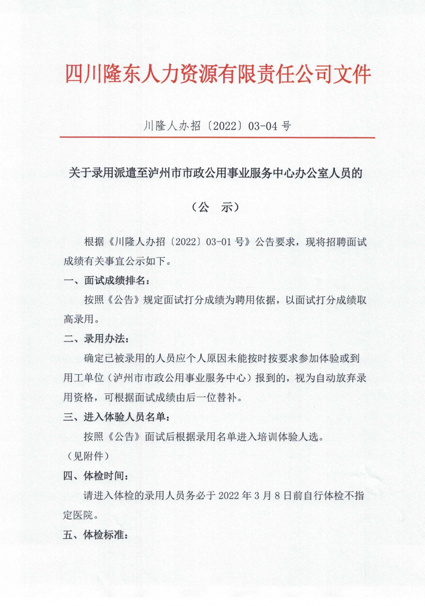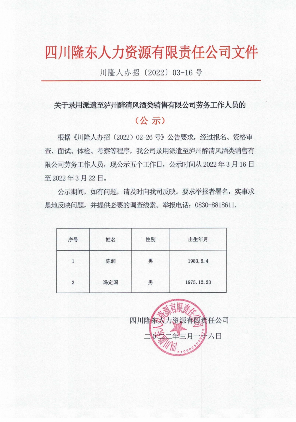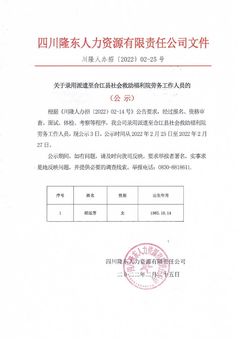 根據(jù)《川隆人辦招〔2022)02-14號》公告要求,經(jīng)過報(bào)名、資格審查、面試、體檢、考察等程序,我公司錄用派遣至合江縣社會救助福利院勞務(wù)工作人員,現(xiàn)公示3日,公示時(shí)間從2022年2月25日至2022年2月27日。