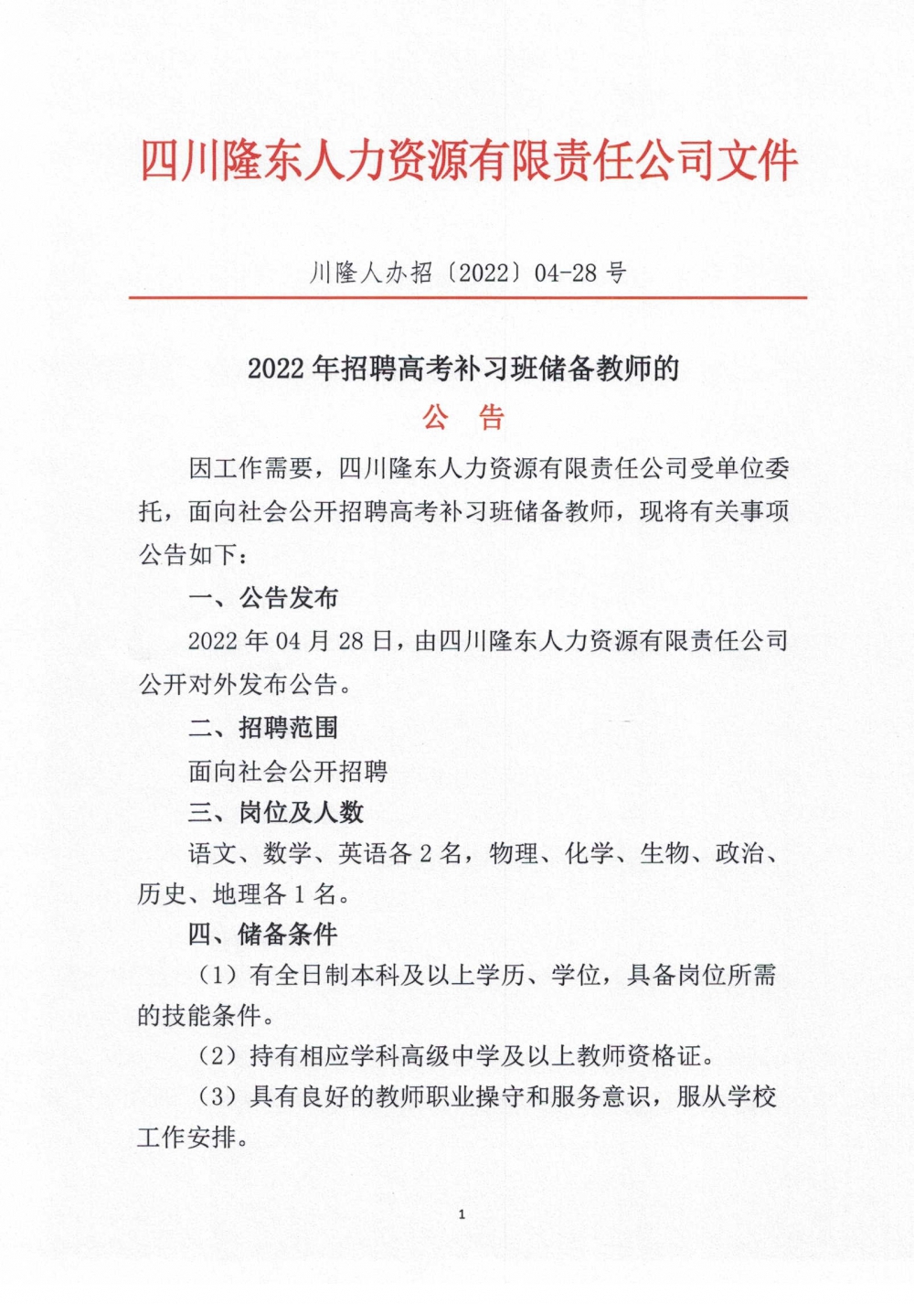 因工作需要,四川隆東人力資源有限責(zé)任公司受單位委托,面向社會公開招聘(儲備)高考補(bǔ)習(xí)班教師,現(xiàn)將有關(guān)招聘事項(xiàng)公告如下