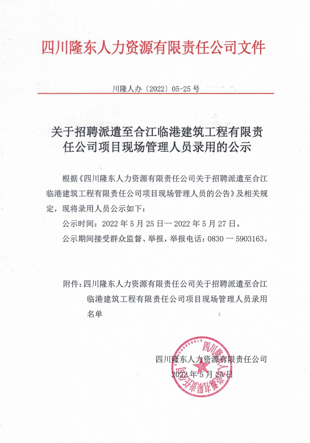 根據(jù)《四川隆東人力資源有限責(zé)任公司關(guān)于招聘派遣至合江臨港建筑工程有限責(zé)任公司項(xiàng)目現(xiàn)場管理人員的公告》及相關(guān)規(guī)定,現(xiàn)將錄用人員公示如下