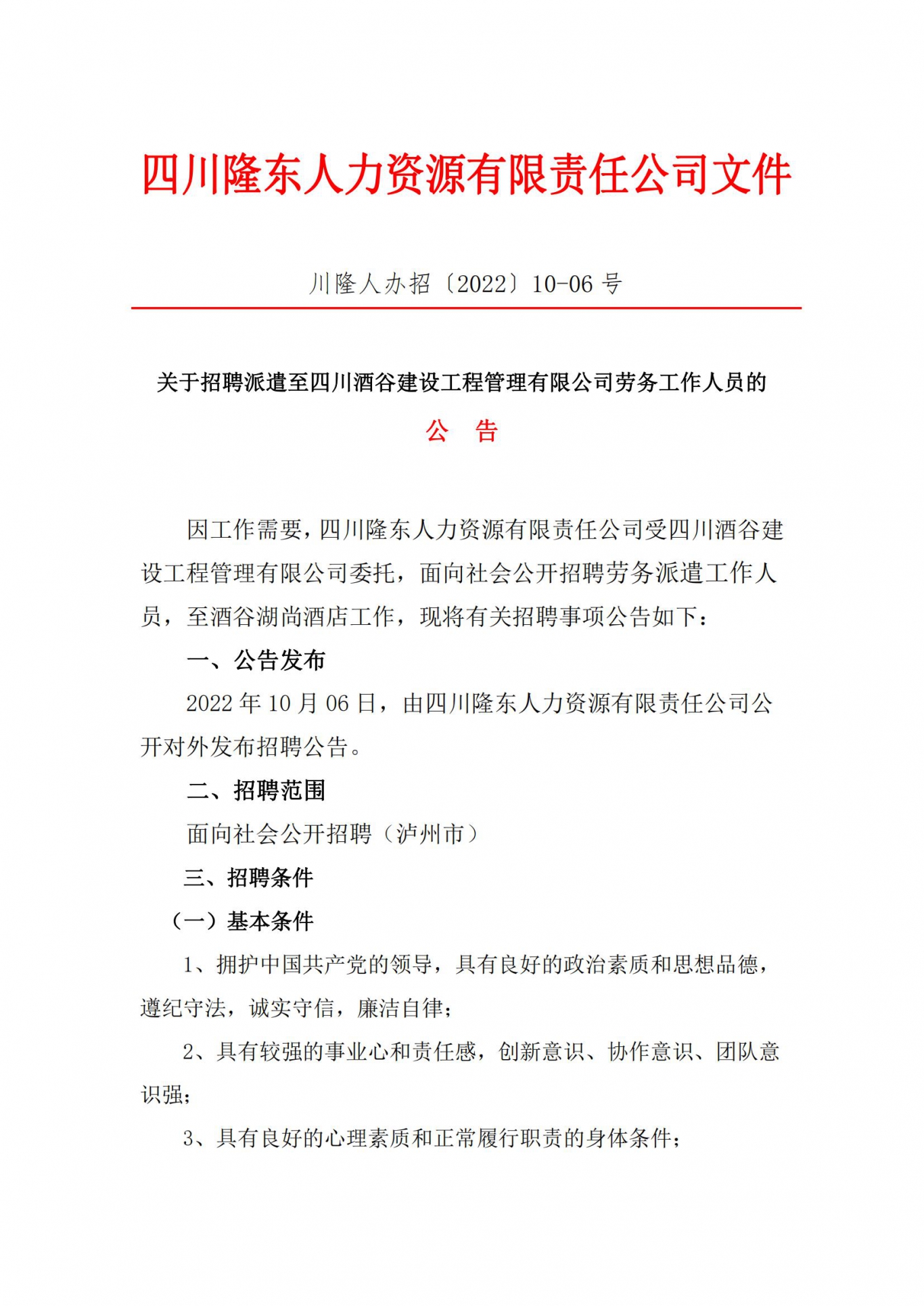 根據(jù)《川隆人辦招〔2022)10-06 號(hào)》公告要求,經(jīng)過(guò)報(bào)名、資格審查、面試、體檢、考察等程序,我公司錄用派遣至四川酒谷建設(shè)工程管理有限公司勞務(wù)工作人員,現(xiàn)公示三個(gè)工作日,公示時(shí)間從2022 年10 月13日至2022 年10 月15 日。